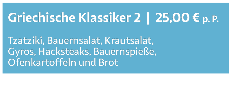 Wie wäre es denn zum Beispiel mit Gyros, Hacksteaks in Tomatensauce, Schweinefilet in Metaxa-Sauce, Bauernsalat, Tzatziki und Reis? Sie können sich nicht entscheiden? Dann hätten wir ein paar Buffetbeispiele für Sie! Vielleicht passt ja davon schon eins?